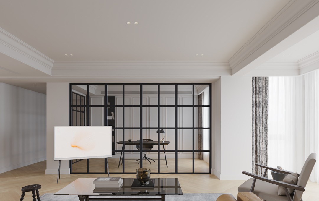 客厅合并了阳台以及书房,来达到一个多元互动感的空间。