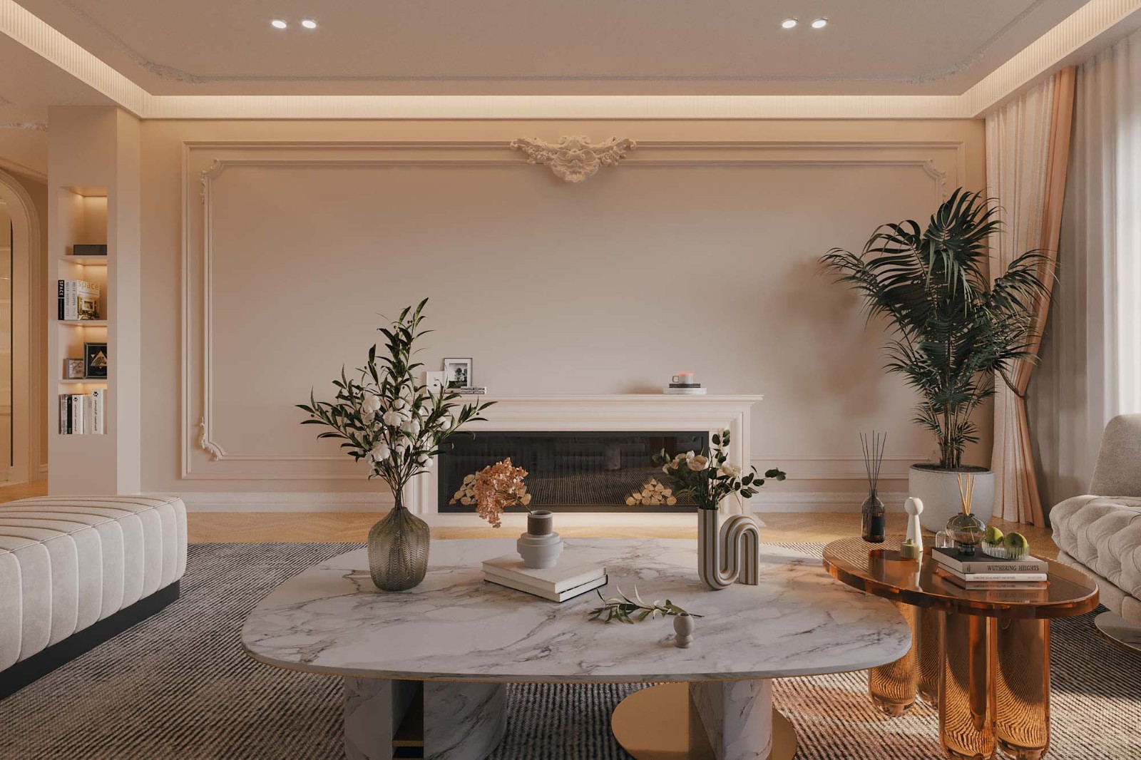 主要突出对称的布局方式,再结合几何线条与浅色的空间色彩,打造出一个法式轻奢主义的空间格调。