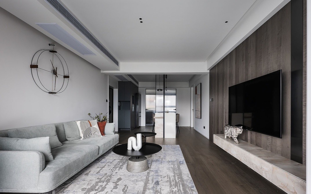 客厅整体以简约为基调,电视背景墙选用木饰面铺满,沙发背景墙则是米白色墙面搭配极简挂钟,左右视野界限分明,层次丰富视觉效果干净清爽。