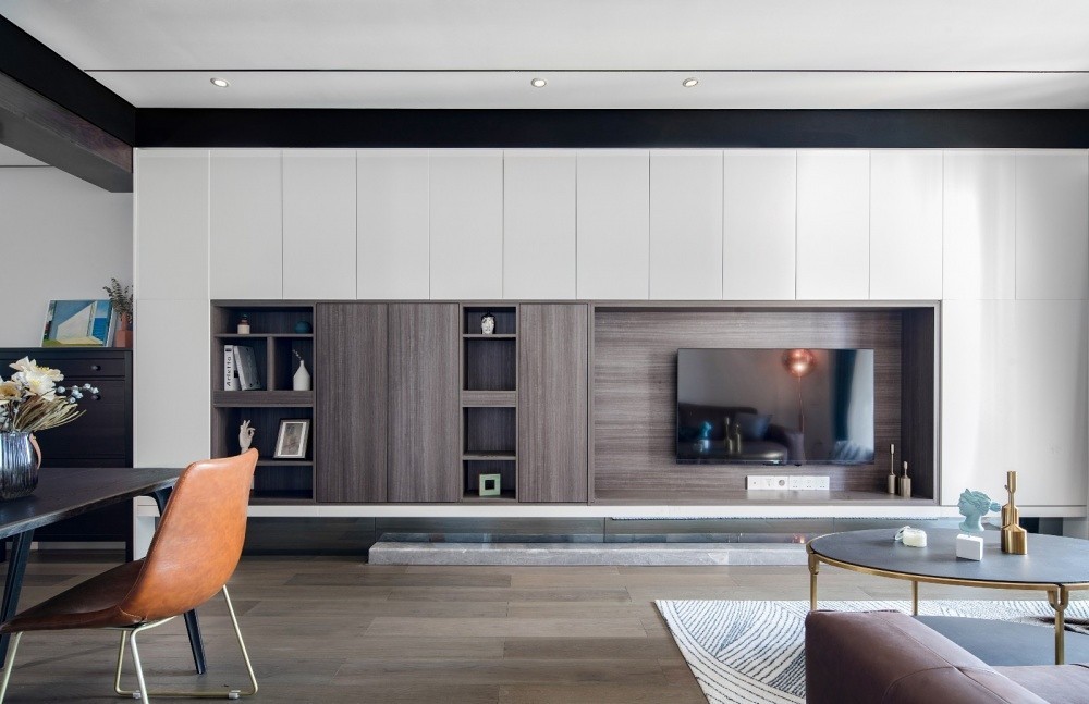 整墙柜体,用吊柜不落地的造型,即使木纹颜色够重又冲突的感到它的轻盈,底下留空贴黑镜,再次放宽客厅。