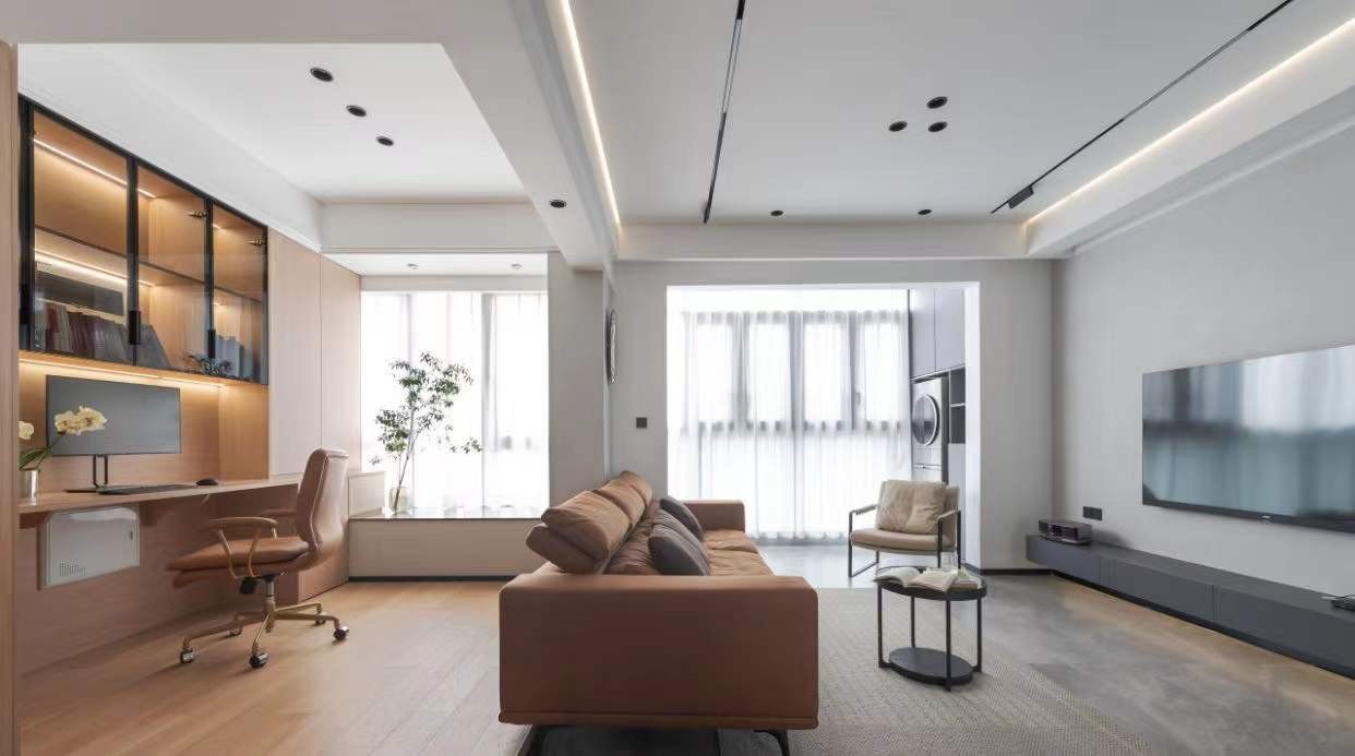 客厅与小房间融入一体,空间视觉上整整大了一倍,书房区域则做地台处理,让空间还是有区域分界感,书房木饰面缓解整个空间灰色地面的冷峻感,在灯光上均采用见光不见灯的处理方式,避免刺眼的光芒。
