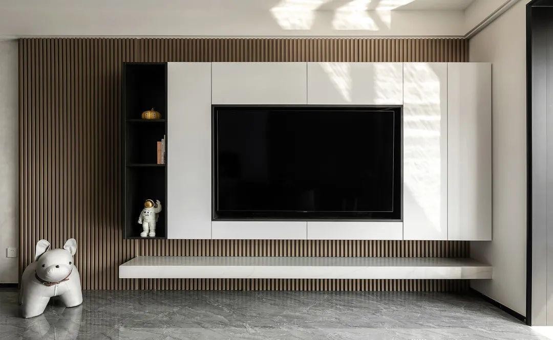 客厅电视背景墙采用柜体、格栅、石材的组合形式,增加客厅收纳。