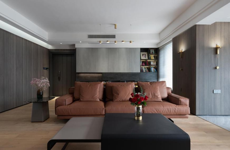 客厅整体色系较为简约,没有传统的大吊灯装饰,简单的大白墙顶,安装了筒灯,褐色皮质软沙发是整个区域的放松空间。茶几是复式黑色和灰色亚克力材质,桌面摆放的红色玫瑰是整个空间亮色的点缀。