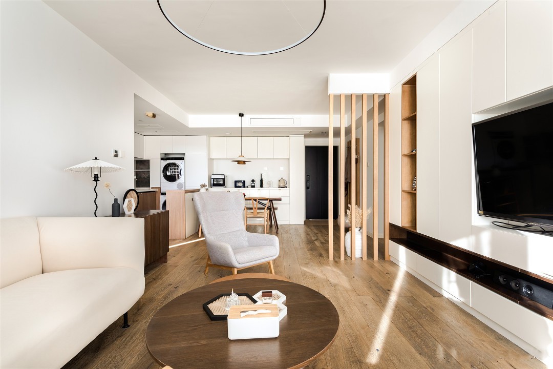 客厅墙、顶,不做过多装饰,仿佛给空间施了增大术。奶油色一字型沙发为客厅平添一抹温柔,在飘窗引入光线的渲染下,为家镀上一层滤镜。 一盏环形吊灯为客厅提供照明,造型上与下方小几形成呼应,空间上下联动性更强。