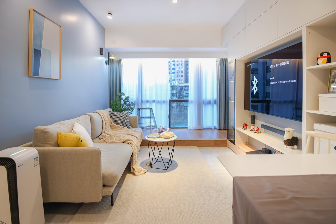 客厅没有主灯,层高比较低,所以采用了明装射灯,窗帘盒里都暗藏了灯带。主卧门改了位置之后,主卧的隐私性更好了。我们把电视柜设计成了2种厚度,靠窗那里薄的一侧把推拉门藏了进去,使推拉门不占主卧内容的空间。