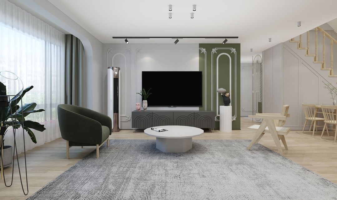 客厅以【浅灰色】和【原木】为主题,打造小清新北欧风,主要以软装为重,整体的家居都以白色和原木色为主,背景墙以绿色做点缀,空间感会瞬间变的清新,自然,舒适~