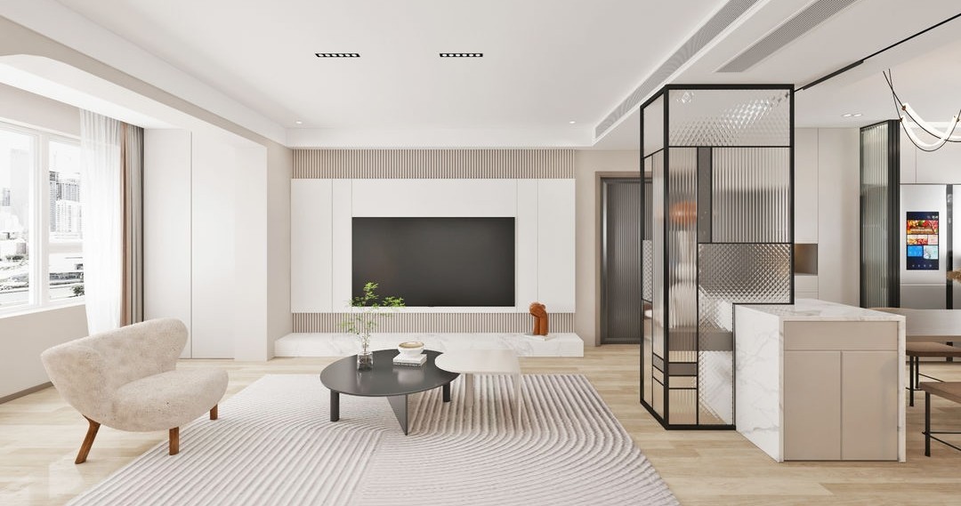 客厅给人的感觉就是纯净,设计简约而有质感,整体空间都为暖色系,呈现出简洁大气的视觉效果。电视背景墙面选用白色钢琴烤漆面板搭配木质格栅板,简约大气,大幅度提升了空间档次,同时又更有质感。