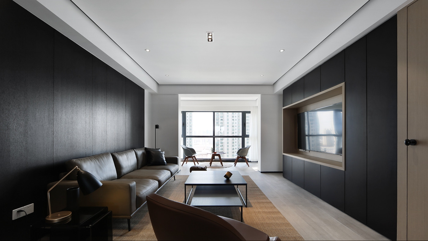 黑白两色在软硬装中切换,配合焦糖色丰富空间色彩却又不觉突兀,造型特别的隔断也让空间层次感更为突出。