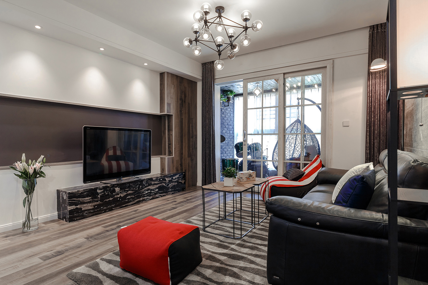 黑白两色在软硬装中切换,配合焦糖色丰富空间色彩却又不觉突兀,造型特别的隔断也让空间层次感更为突出。