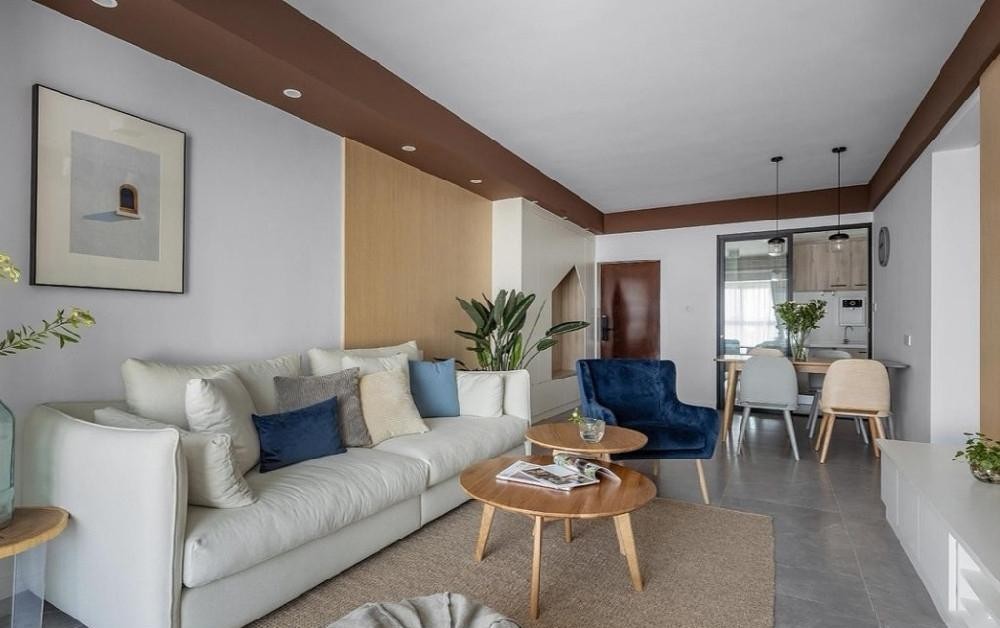 客厅作为空间交互场所,利用细腻缜密的科定木饰面作为沙发和电视墙的背景过渡。