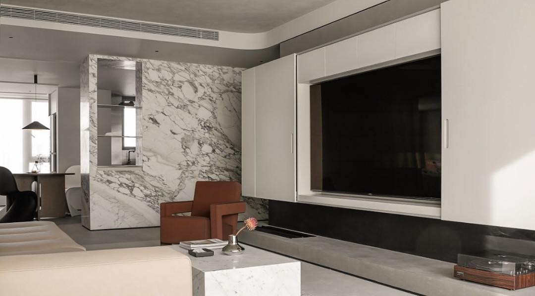 入户后左手边根据原有的结构优势做了入户柜,整面的柜体提供足够的收纳储藏功能。中间留有开放格,提供了基础的玄关收纳功能,还将可视电话放在了里面,以保证右手边整体大理石材质的完整性。