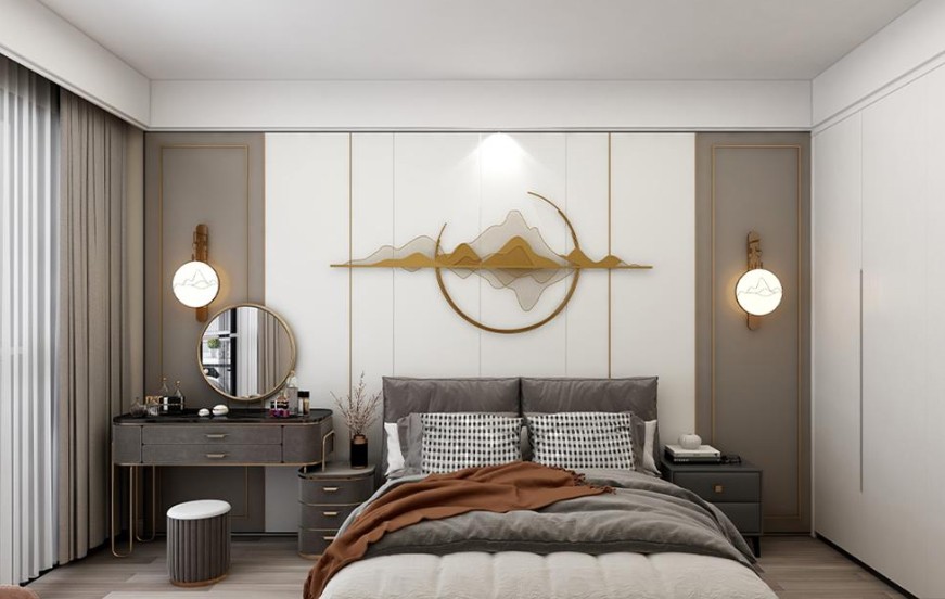 设计灵感来源于“云中月,月下山”的古典致雅的意境。床头上方的云、月和山的造 型以及两旁的圆形壁灯,梳妆台上圆形的镜子和圆形凳子无一不体现着设计的理念。