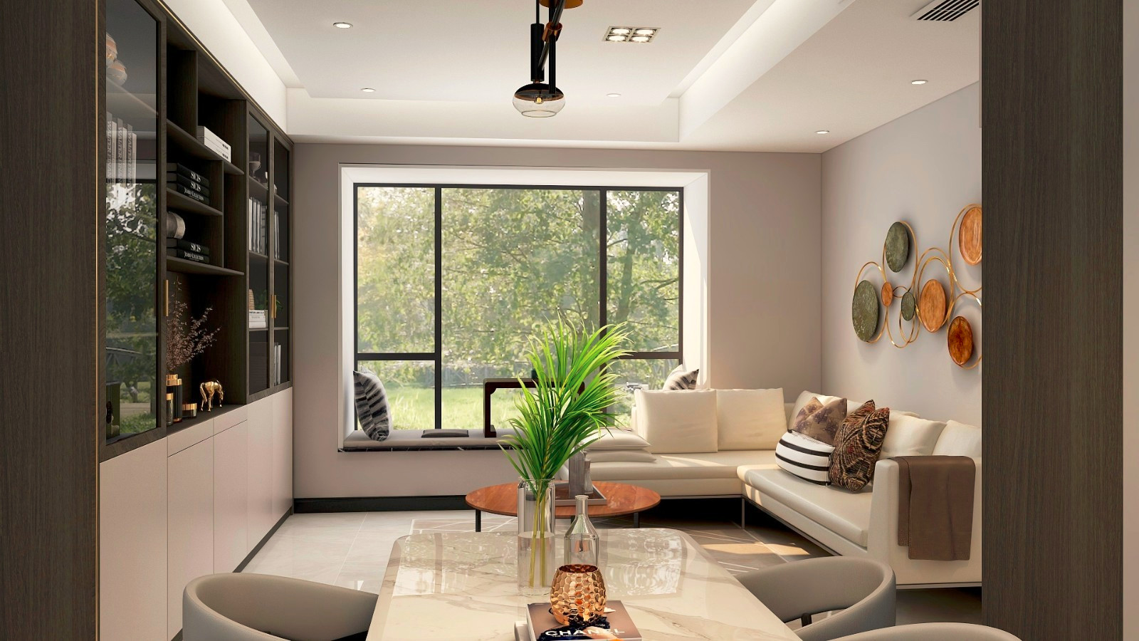 业主取消电视机,原电视墙做满墙书柜,客厅即是会客厅也是休闲区