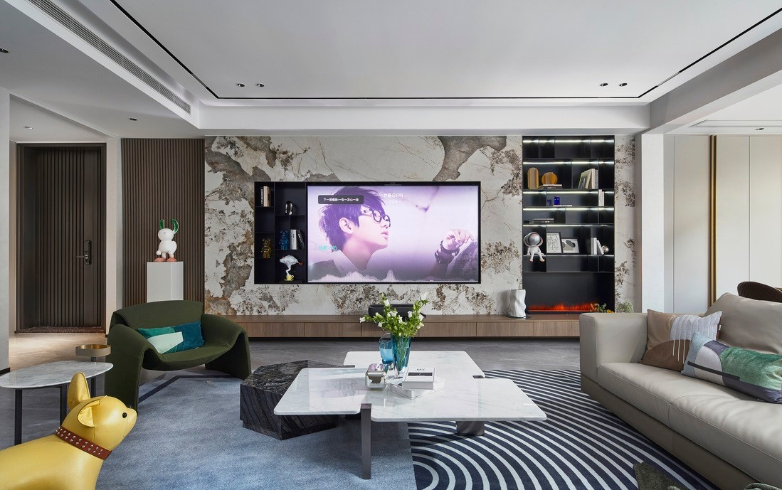 以轻薄的潘多拉花纹岩板配以木格栅与黑色哑光金属重新建构,瞬间延展了空间视野,岩板天然的纹理走向,给柔和的整体加入了局部锐化的层次感,简约干净的空间,嵌入式的金属柜给了壁炉一个刚好的位置,格外的整体与自然。温润的木饰面地台与格栅相互呼应,加以灯带来晕染,避免了石材与金属带来的冰冷感。