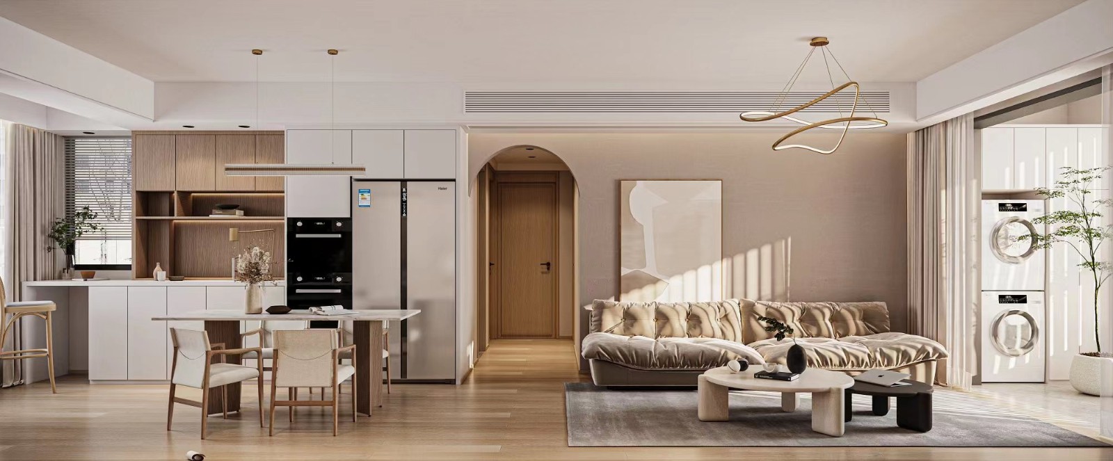 简单的线条+简单的组合,再加入超现实主义的无框画,就构成了一个舒适简单的客厅空间。另外以多功能组合柜为沙发背景,以及铝合金与钢化玻璃等材料的应用,都是现代风格家具的常见装饰手法。