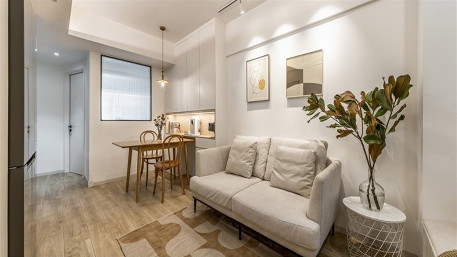客厅沙发旁边有一个承重柱,深度是420毫米,齐平柱子的厚度做了一个收纳卡座,下面做了可以储藏客厅收纳物品的无把手抽屉,由于空间的限制客厅没有摆放单人位,长度达2米的卡座可兼顾朋友聚会时坐。