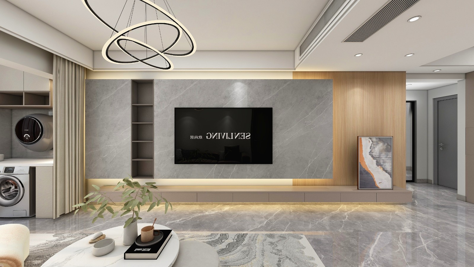 客厅石材与木饰面搭配。