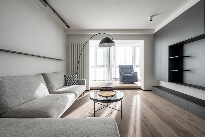 客厅: 从玄关处向左转,是宽敞明亮的大客厅。 天花板顶面不设任何石膏线装饰,直接采用无主灯式照明,明装筒灯+磁吸轨道灯,足够满足日常照明需求,同时还会让灯光更富有层次感。L型灰色布艺沙发靠墙摆放,矮靠背的款式在视觉上拉伸层高,完美避免了产生大型家具,容易让空间显得拥堵的问题。浅木色地板与柜体的木饰面相呼应,中和整体黑白灰的冷,让空间柔和了下来。最靠近入户门的地方,留出一小块开放式置物区,方便随手放