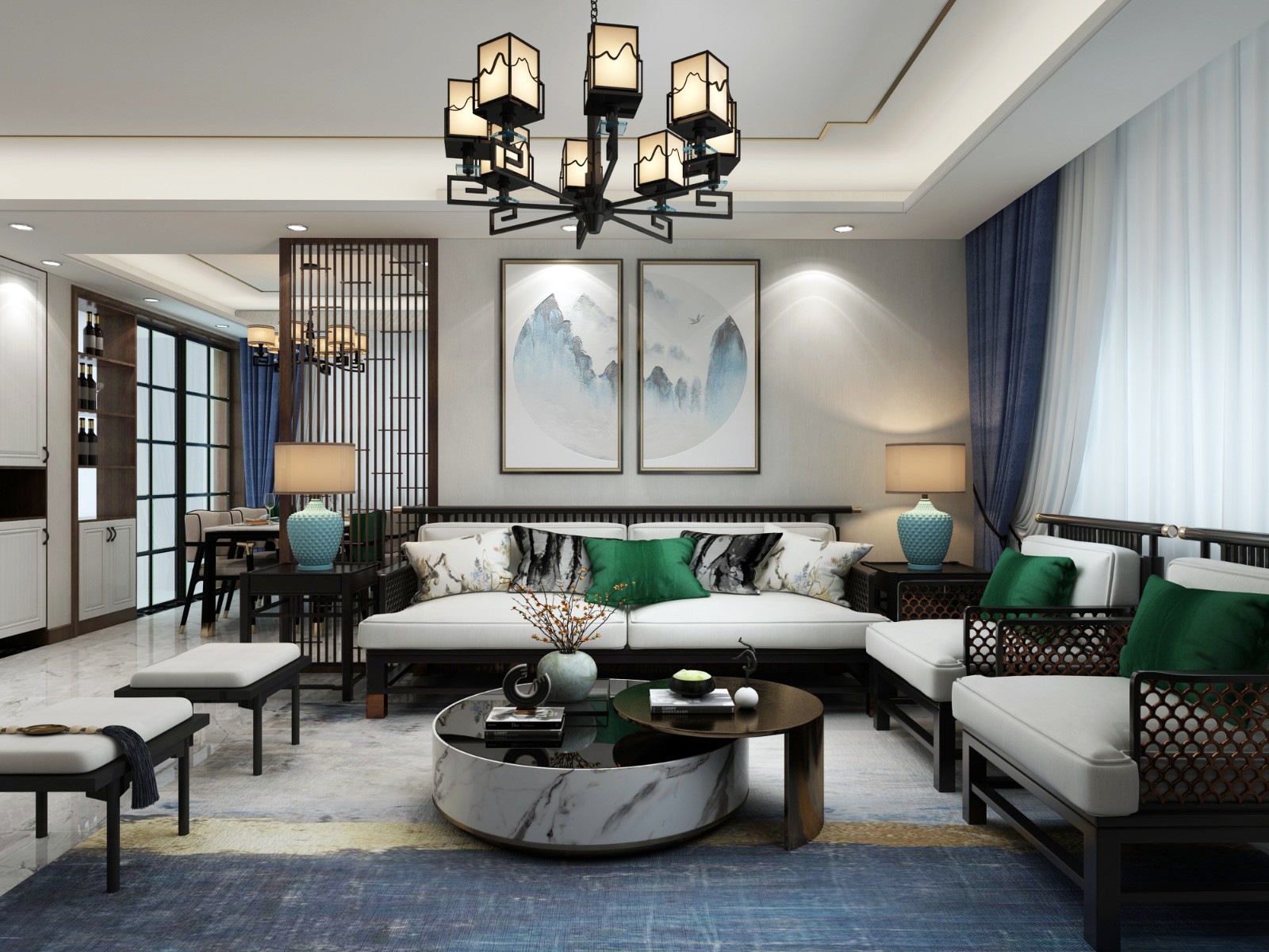 三卧室朝阳的户型,业主喜欢新中式,尽量做得深浅搭配的柜子。