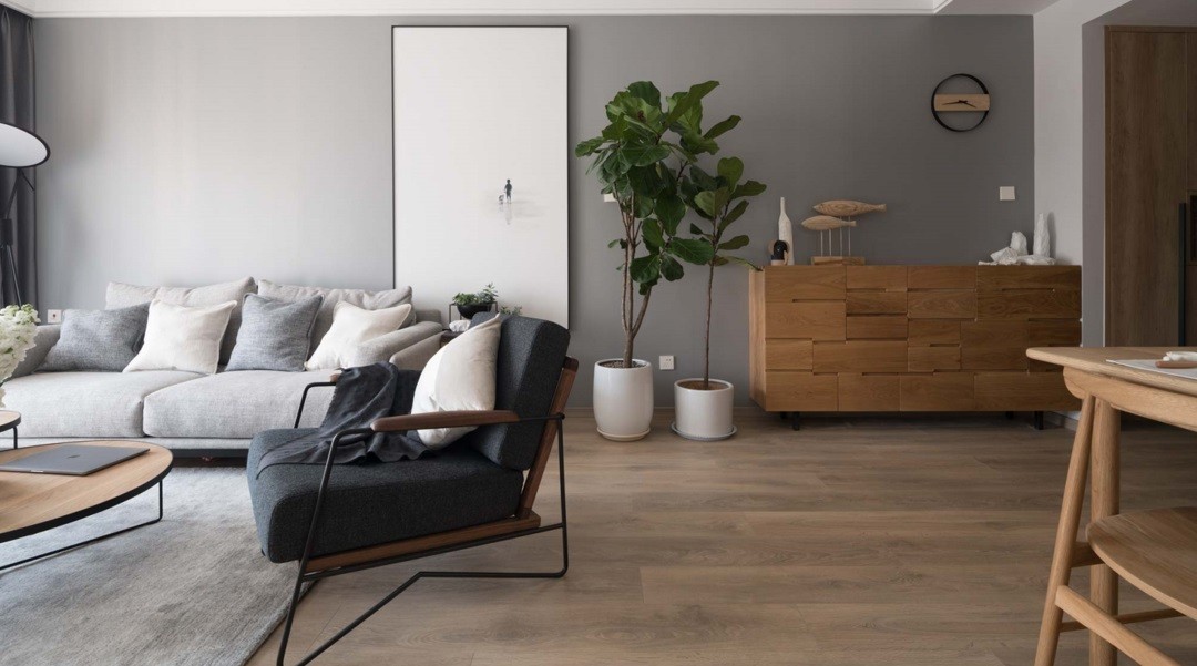 冷灰色布艺沙发,搭配上黑框原木小茶几,优雅实用提升空间舒适度。一体式吊顶设计,空间更宽敞,为避免太空旷。