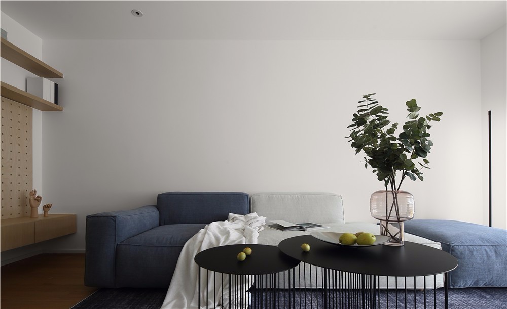 因为业主的预算比较有限,我们在墙面处理上都是特别的简单,用的材料是乳胶漆,那在软装上希望有一些视觉冲击,选择了有彩色的沙发,丰富空间的视觉感