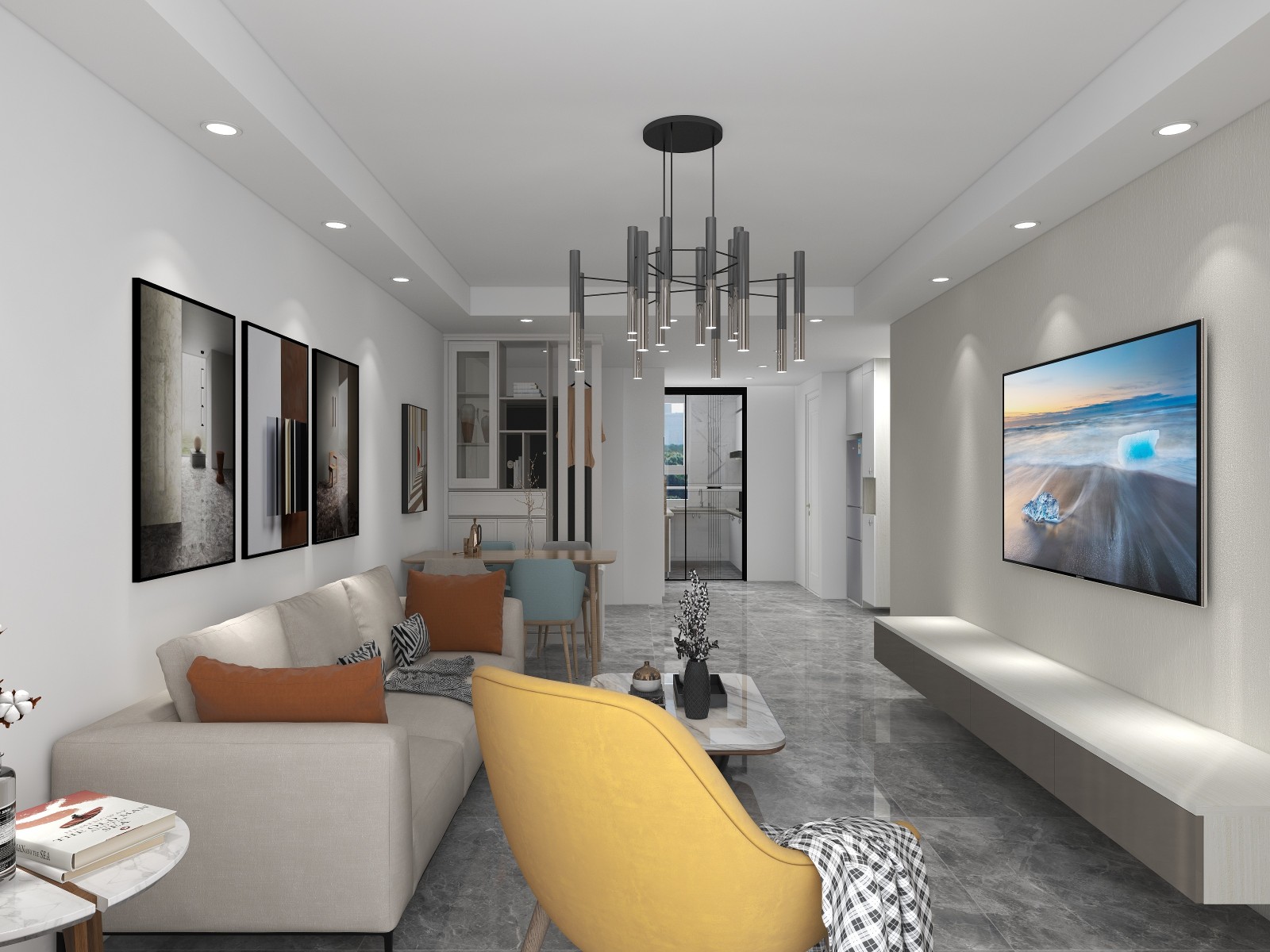 客厅做了简易壁布背景墙,外加一个悬空电视柜,既有美感又简洁大气