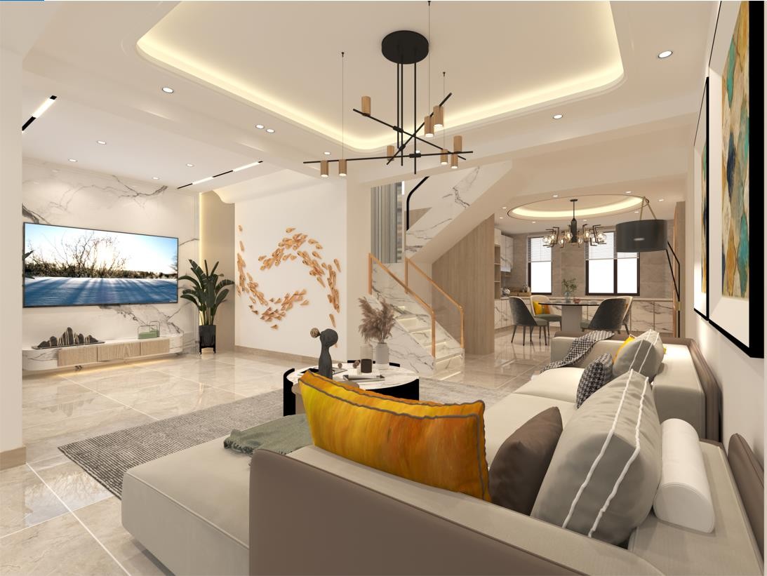 客厅整体采用了暖光设计,地面采用暖灰地砖