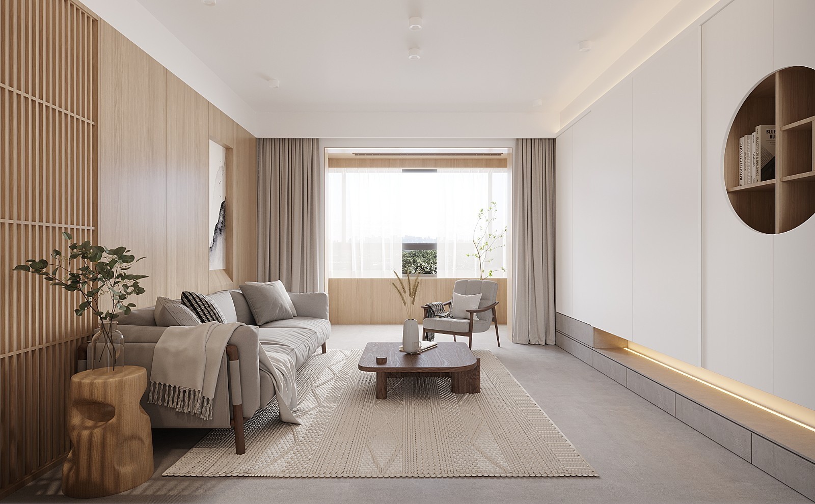 整个空间以白色作为主基调,通透又明亮,大面积木饰面的加入,让整个空间涌入木质元素的自然和温馨。电视背景墙摒弃了传统的装饰造型,利用隐形柜门作为画面留白面,满足实用收纳的同时,为空间引入写意的画面。