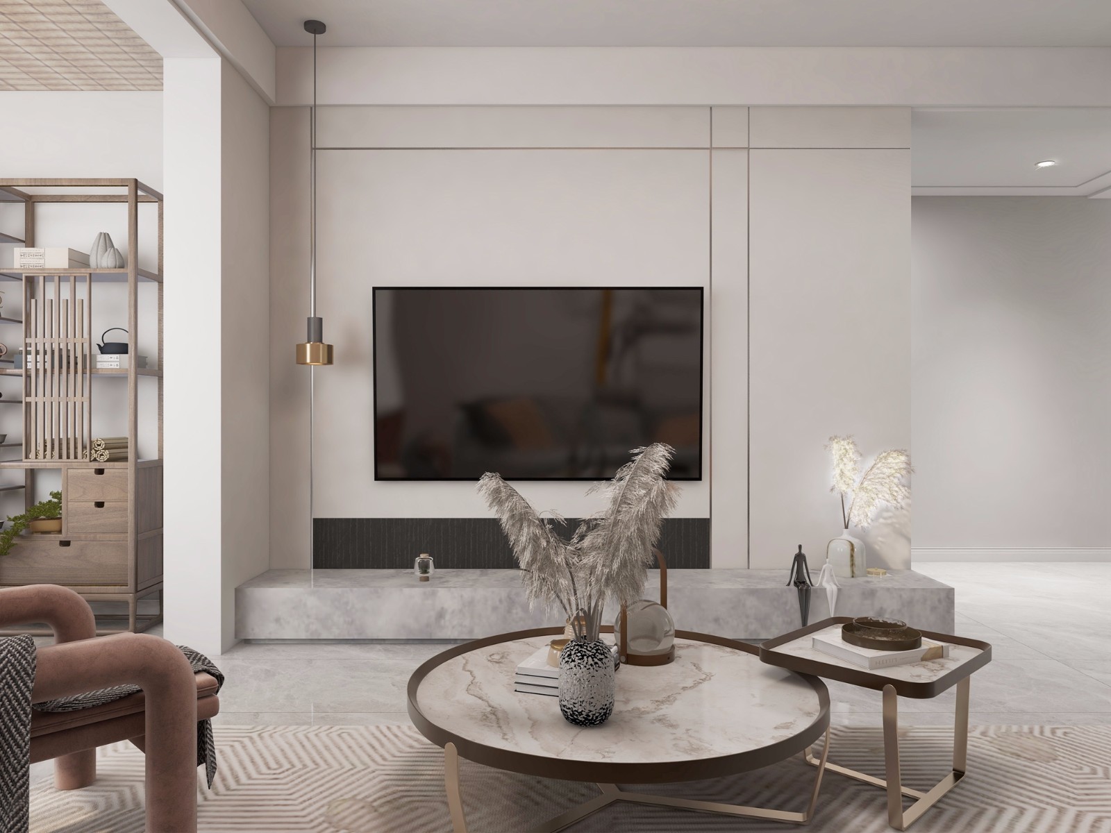 客厅:客厅打通之后格外显大,色调偏暖,背景墙线条设计增加层次感