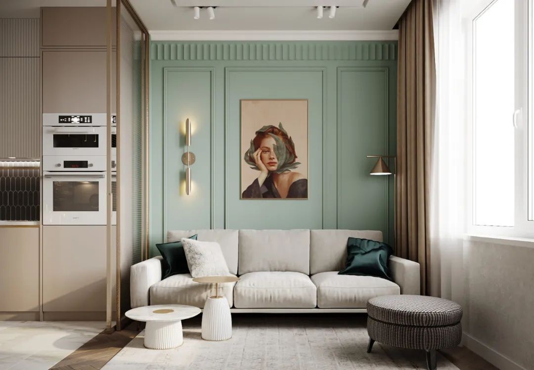 功能齐全的厨房和客厅,结合了浅米色和薄荷色的墙壁、大理石纹理的电视背景和玻璃隔断。以简为序,把阳光引入室内,整个空间都明媚起来,并将所有细节做到。