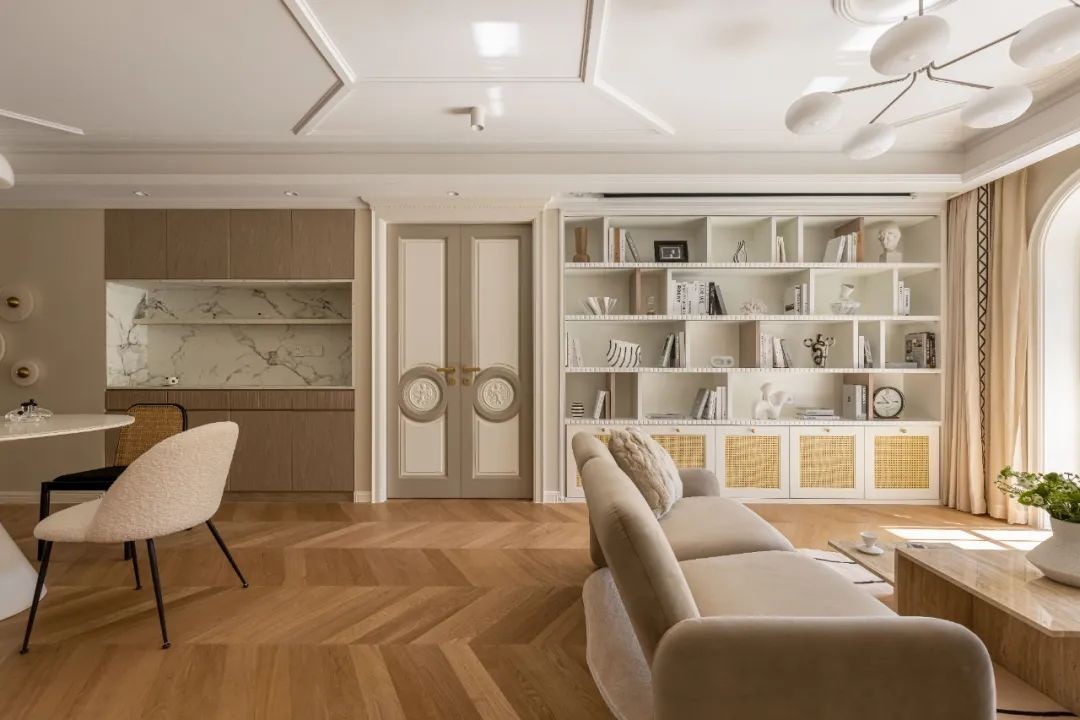 南北贯通的客餐厅采光良好,无论是围坐的沙发区还是圆桌就餐区皆呈现了其乐融融的家庭氛围。卡其色、奶咖色、白色,点缀木色及藤编元素营造了休闲温馨的家居场景。入户对面的组合壁灯让人眼前一亮,夜幕降临,柔和的灯光散发出氤氲的光圈,餐厅充满了浪漫诗意的就餐氛围。 复古黑色壁炉作为客厅的中心,是空间的一抹重色,夜晚打开壁炉,在红色灯光氛围的映衬下,一家人围坐在一起谈论家常,悠然自在。 书架用奥松板现场制作