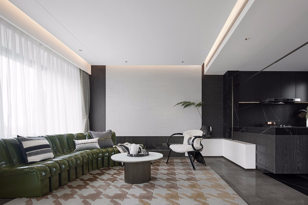 开放式厨房与立面的留白,使整体空间更具统一性,金属边框的局部包裹,纯净之中凸显质感沉淀,亦成为视觉焦点。