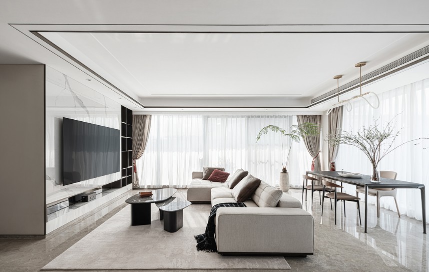 客厅以低饱和度的色调贯穿整个空间,舒缓柔雅,布艺米白色沙发搭配浅色的地毯,展现出和谐统一的空间质感。
