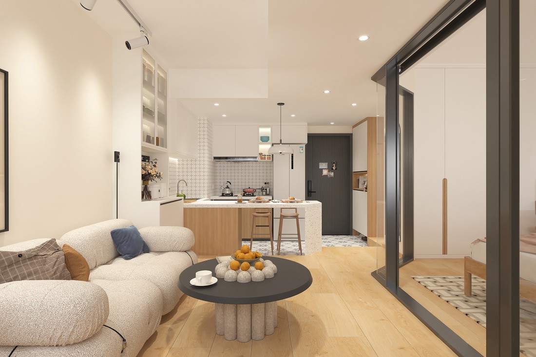 现在入门左侧是卫生间,右侧变成开放式厨房还带吧台式用餐区(工作区)