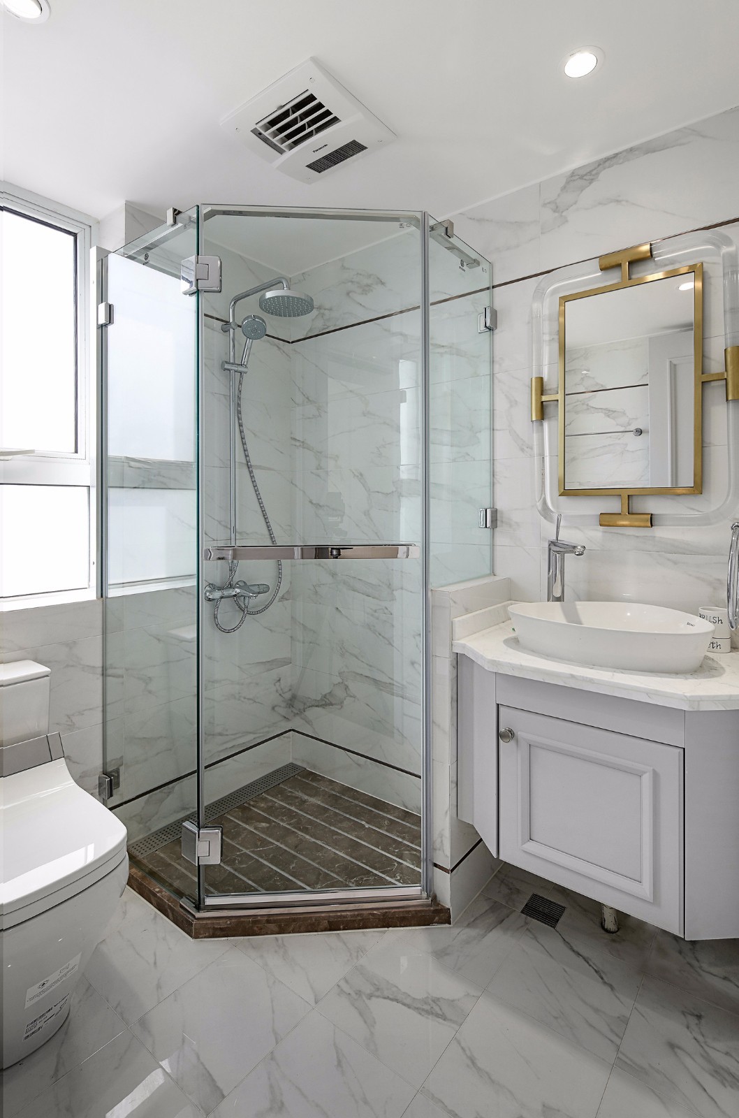以镜面、金属、玻璃、瓷砖等材质的质感和独特的属性,来拉伸整个卫浴空间感,并且保证了室内充足的光线和通透性。