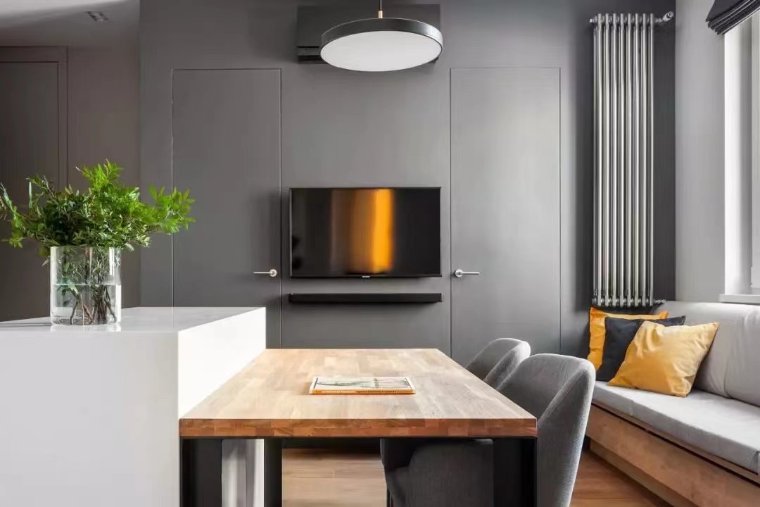 餐厅位于整个房间的中央位置,是一张木质长餐桌,造型简单实用。