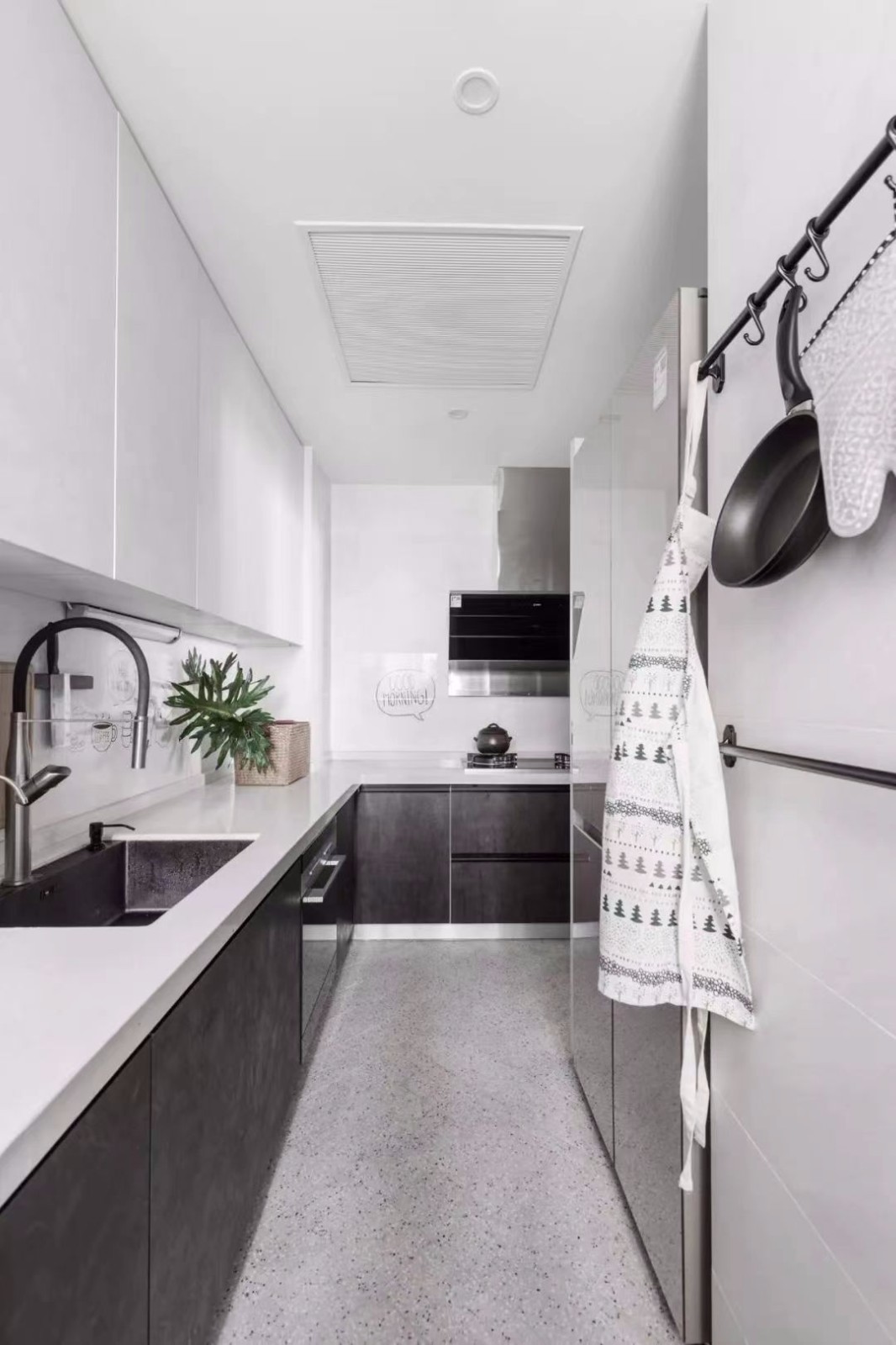 厨房整体现代轻奢的灰色调空间,让做饭的空间也轻松年轻自然,L型的操作台,也是使得做饭的空间更加实用方面。