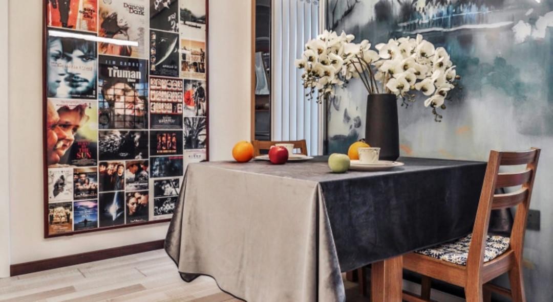 餐厅空间侧边为壁画推拉门,可做背景装饰也可左右滑动用作厨房或者卫生间门(当然卫生间内部还是做了干湿分离处理的)。