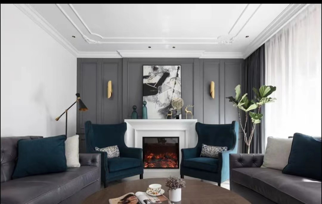 沙发选择黑色牛皮沙发,这也是在美式风格中常见的色调及材质,电视背景墙同样做了很巧的收纳设计