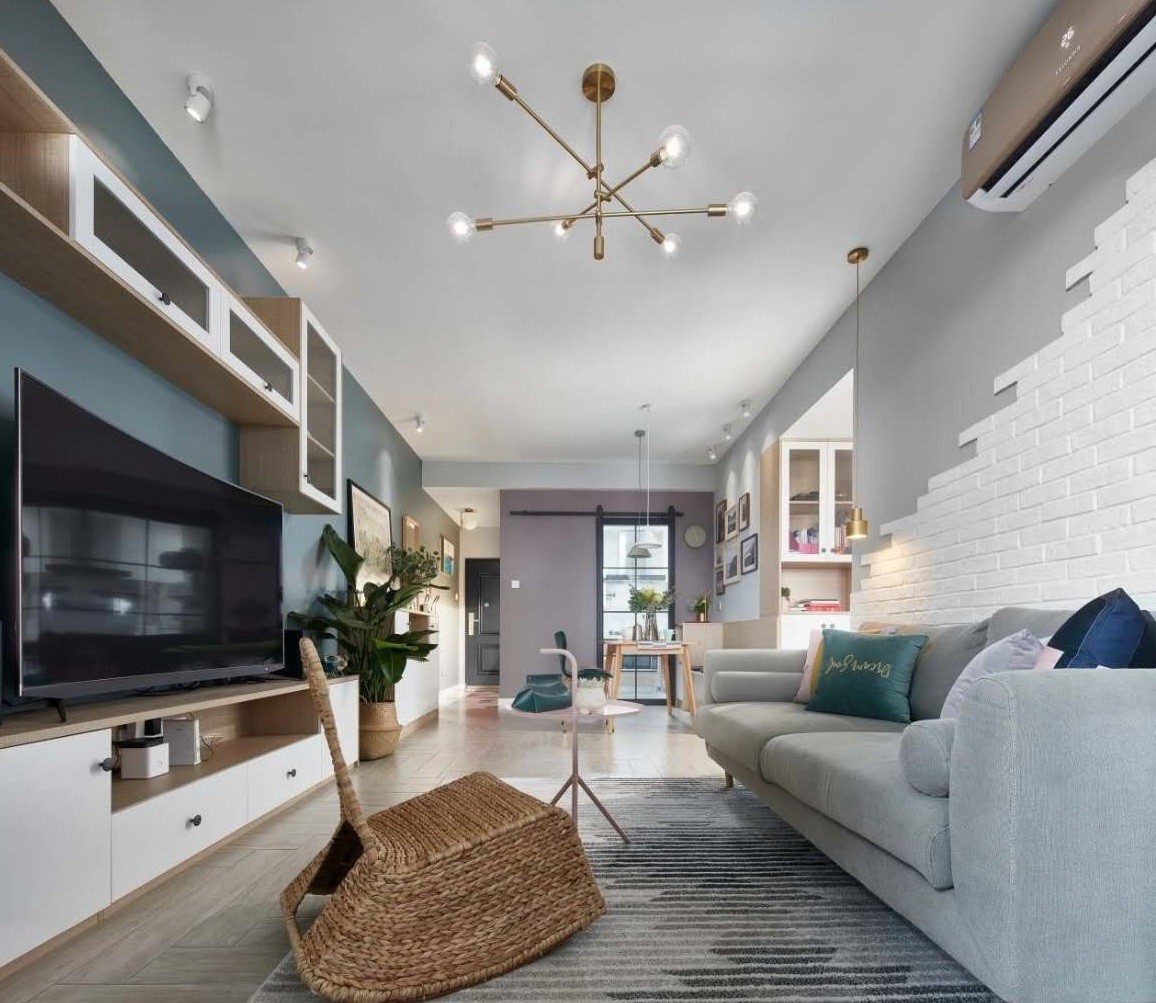 本套是一套建筑面积为75㎡,使用面积仅为55平方米的小户型住宅,2室2厅1厨房1卫格局,面积虽不大,无处不在的收纳,比如餐厅的卡座,过道的收纳柜,电视组合柜等,足够的储物空间及功能规划
