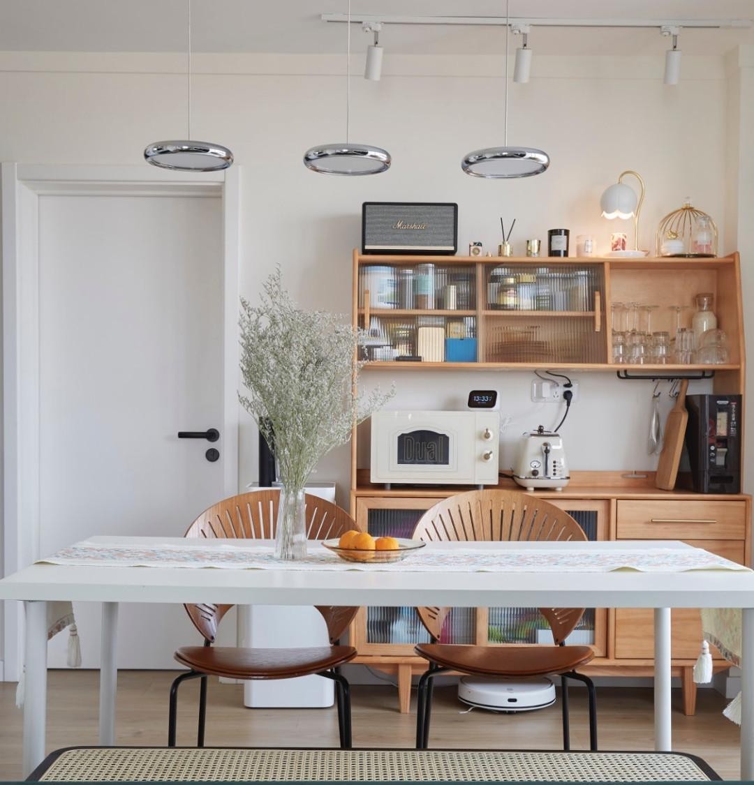 黑色藤编椅:源氏木语 米家吸尘器:K10 边角柜上面放上朋友送的香氛、灯啊小礼物做展示,中间补充餐吧的一些收纳功能藏***瓶罐罐,搭配复古的微波炉和面包机,实用又好看!