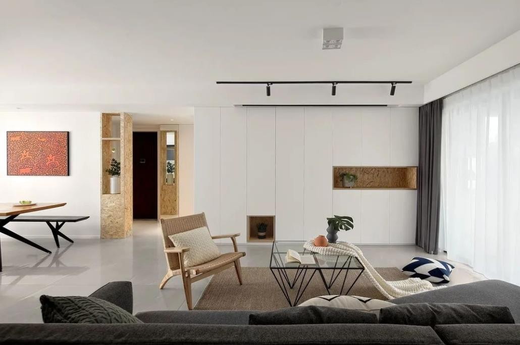 原始户型先天条件好,宽敞的入户门厅作为入户过渡空间增加了室内的私密性,也增强了入户的仪式感。餐客厅空间宽敞采光好。缺点:主卧+卫生间空间规划不合理。把空间打碎重新整合,打造舒适明朗二人居。