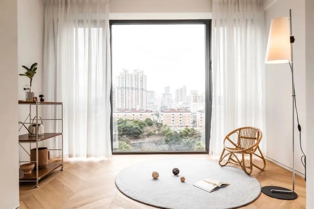 阳台和客厅之间不做隔断, 延伸了公共区域的空间感。 设计师特意把阳台的窗户, 换成了中间整块大玻璃的款式, 可以更好地把窗外的美景引入室内。