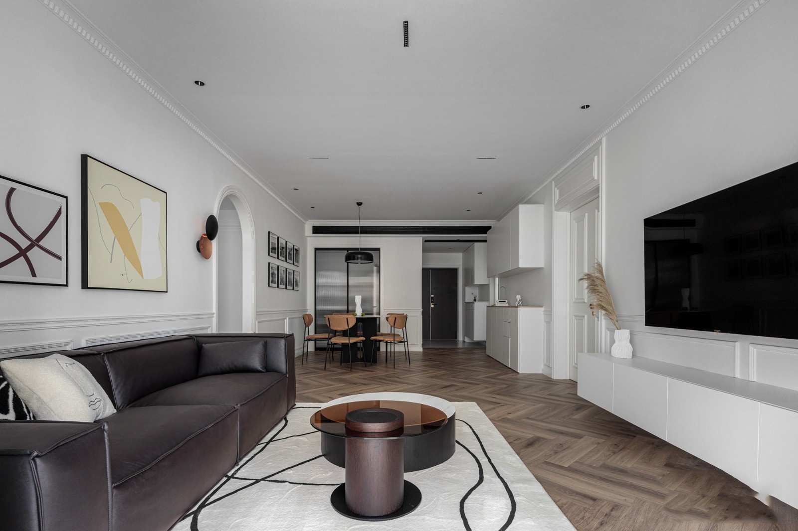 餐厅与客厅以浪漫的法式拱形门隔开,仪式感得以展现。选择圆桌,富有围合感的就餐氛围,让一家人更显和乐融融。