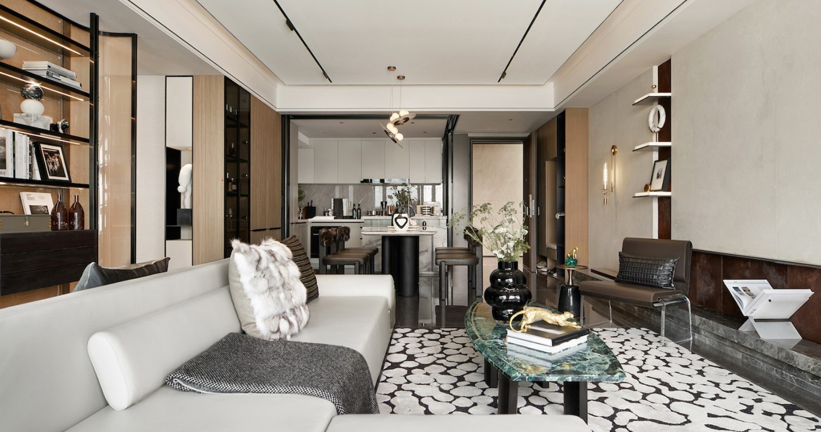 轻奢风格,木饰面为主。