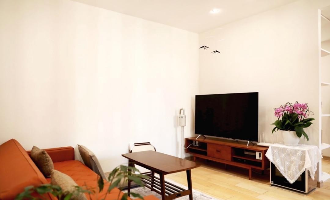 木格栅内侧是客厅,枫木色地板搭配贴有壁纸的白墙,整洁、宽敞。摆放色彩较为艳丽的沙发,也不会显得突兀。