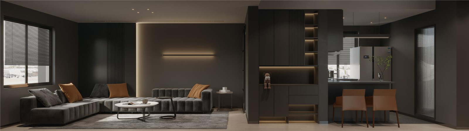 整体以灰黑色乳胶漆为基础,配合同色系软装