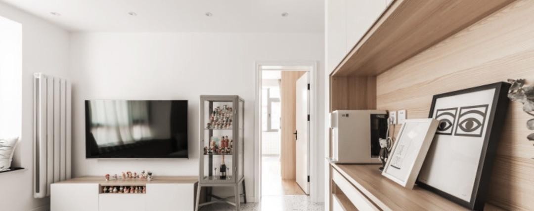 电视柜的款式选择了宜家的贝达系列,为了和整体呼应,配色选择了橡木色台面和白色柜体做搭配。