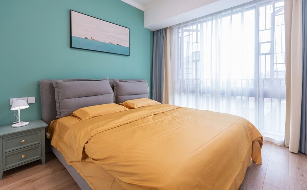 清新简单的卧室,选择了与客厅同样的背景色调。黄色的床品四件套墙整个空间活跃不少。业主特意 买的新床品,哈哈哈哈~搭起来很是不错~