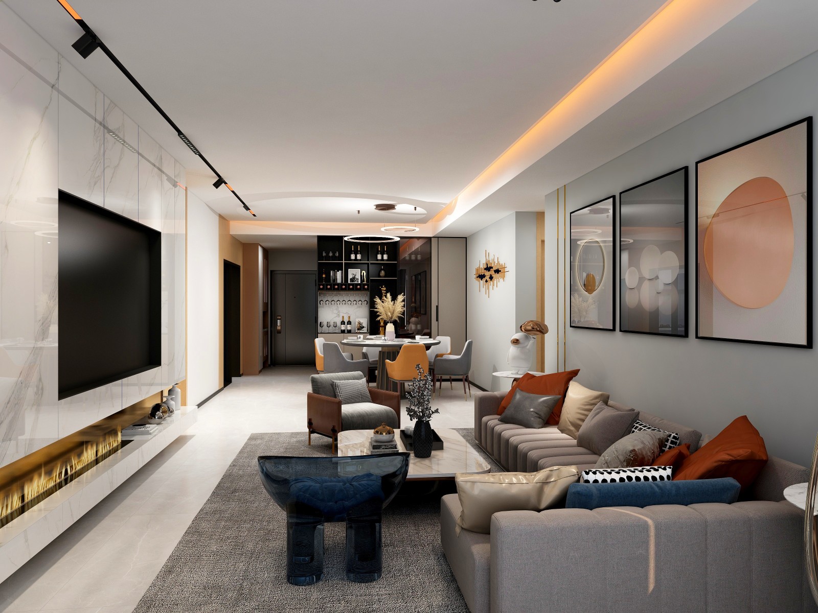 客厅做了无主灯设计,将客厅和餐厅的吊顶做了一体式设计,让视觉享受提到***